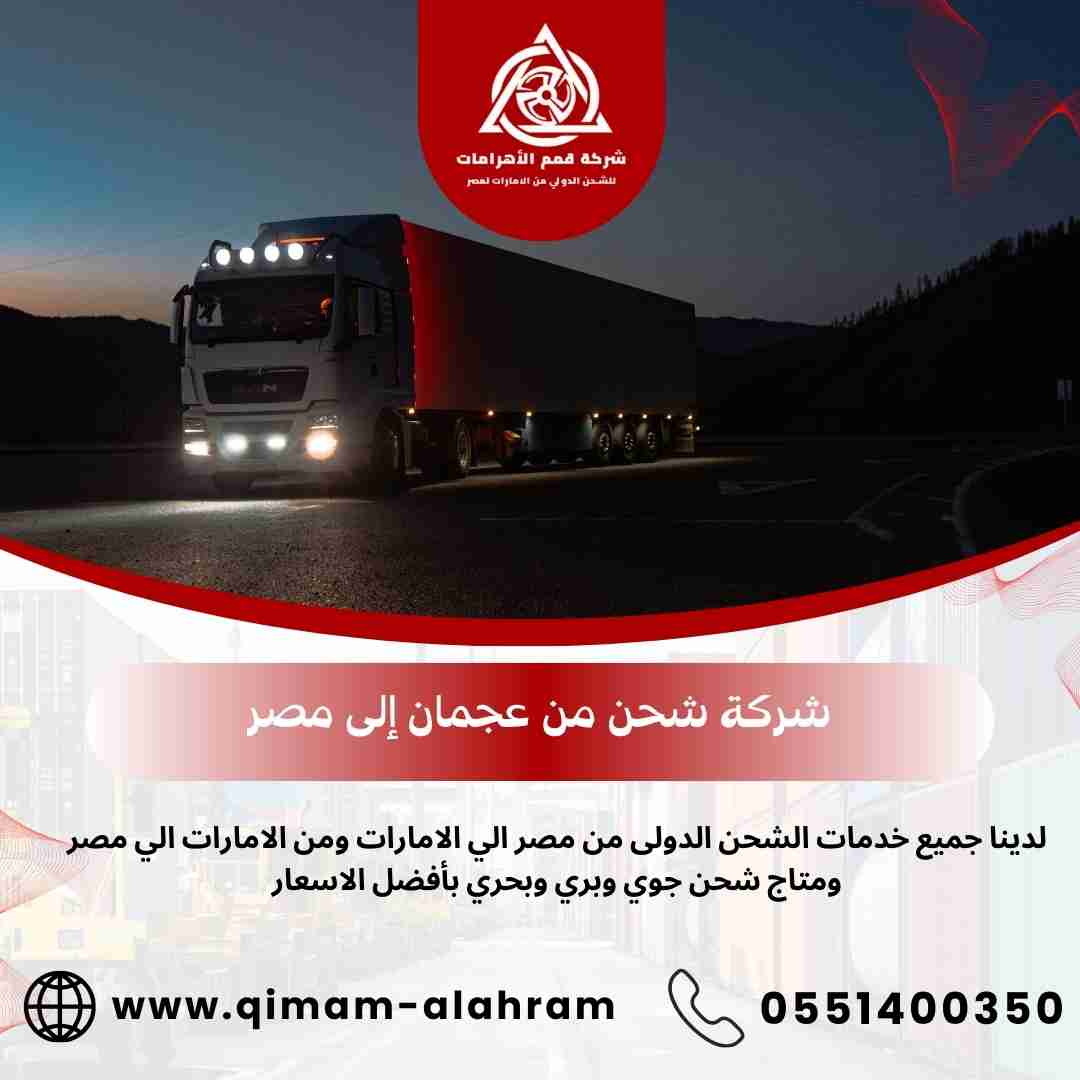 شركة شحن من عجمان الي مصر توفر حلولاً شاملة لنقل الأثاث والأغراض الشخصية والتجارية بأمان وسرعة عالية. اعتمد على قمم الأهرامات لضمان رحلة شحن مريحة من الإمارات إلى أي محافظة مصرية.